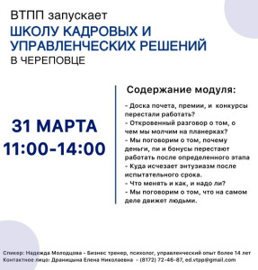 Союз «Торгово-промышленная палата Вологодской области» запускает в г. Череповец «ШКОЛУ КАДРОВЫХ И УПРАВЛЕНЧЕСКИХ РЕШЕНИЙ»